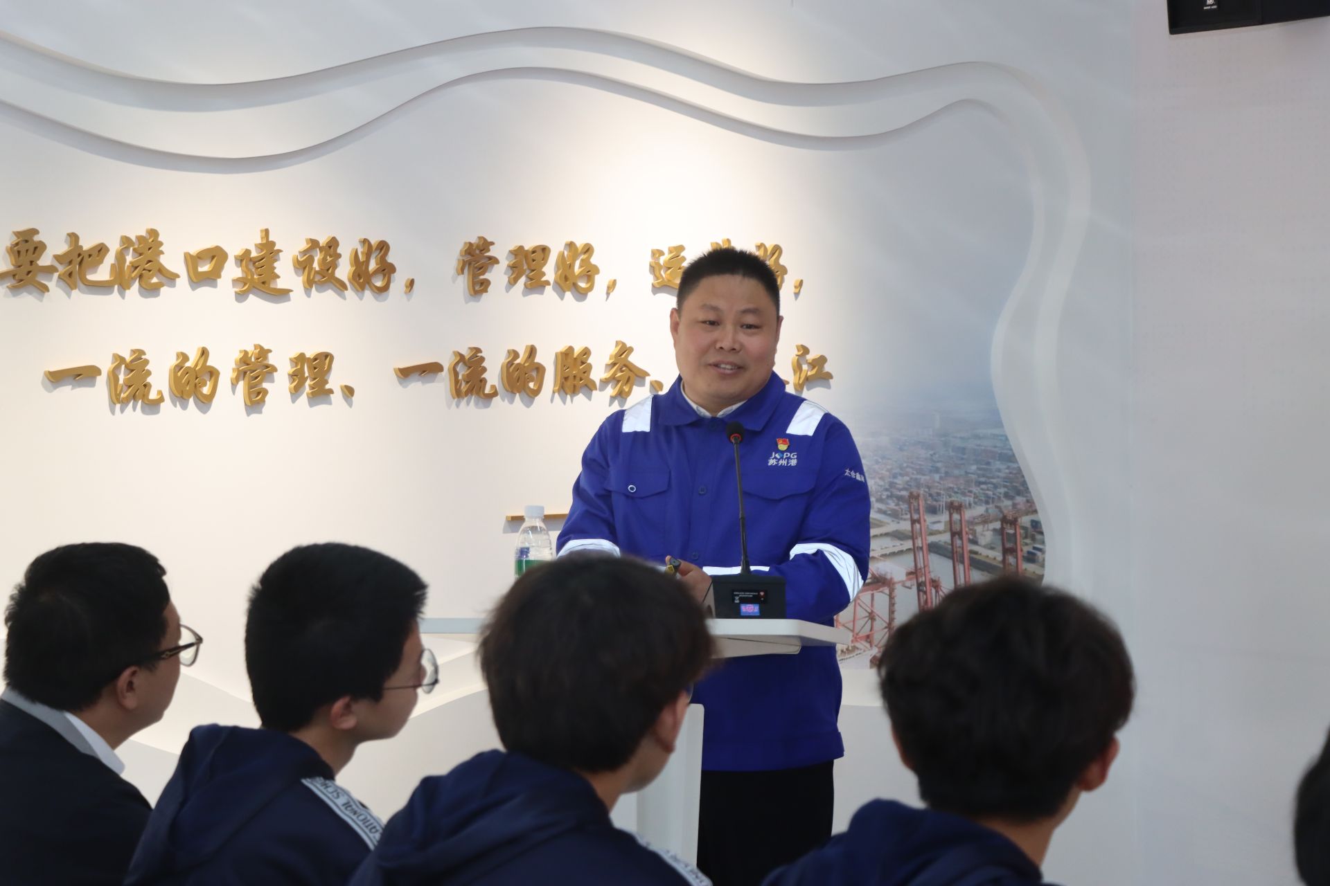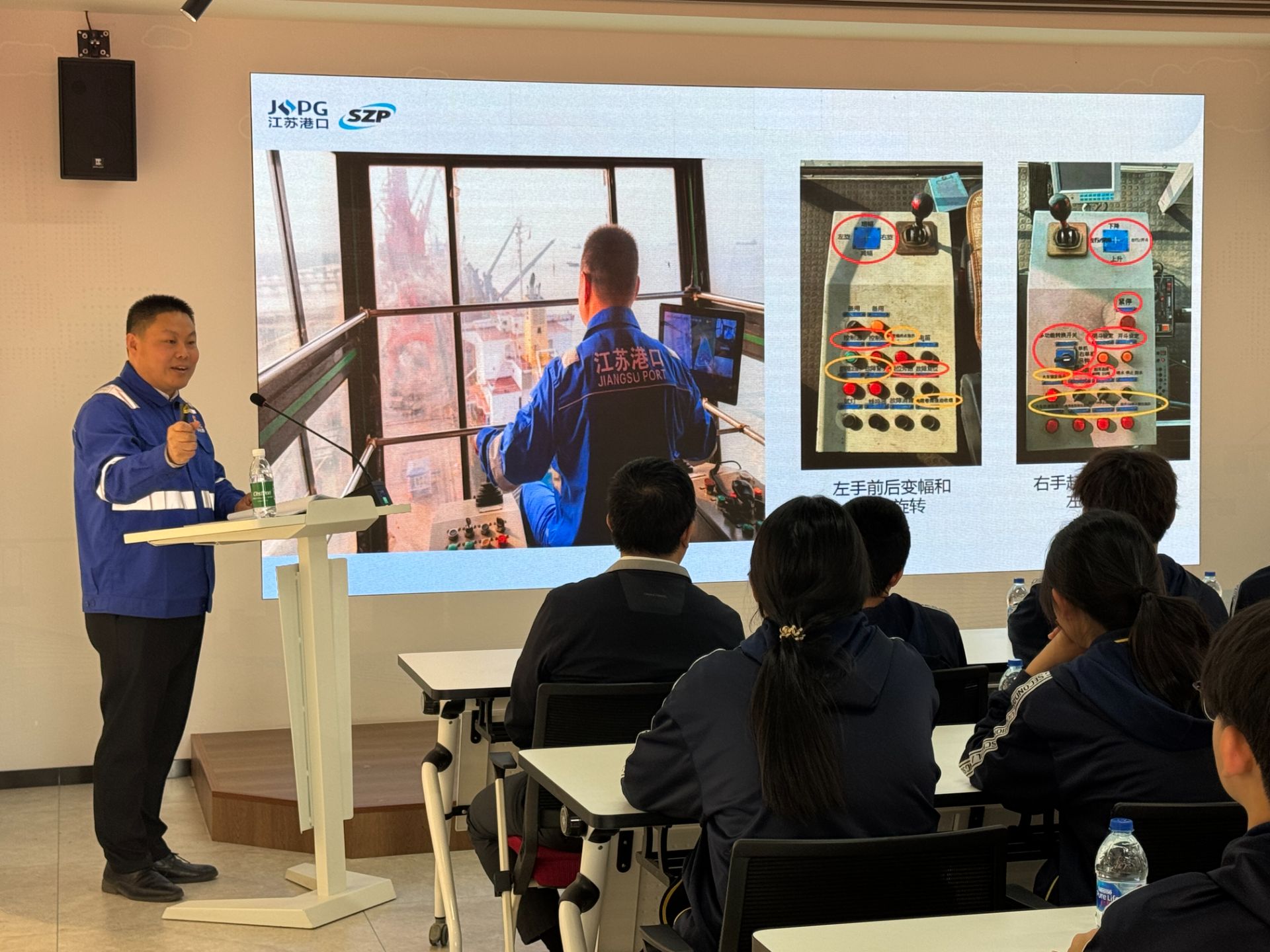 接着,为了让同学们获得更加丰富的研学体验,由全国人大代表、苏州港集团太仓鑫海港口开发有限公司门机班大班长褚锋为同学们授课。