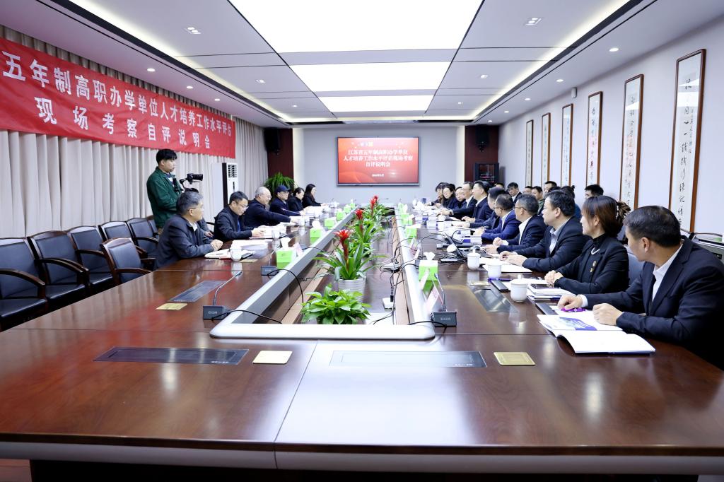 丁亮以《树联院思维,强高职意识,办高水平五年制高职教育》为题,作了学校评估自评汇报。
