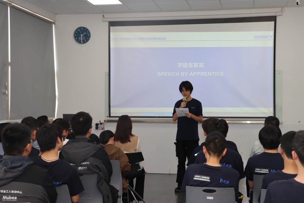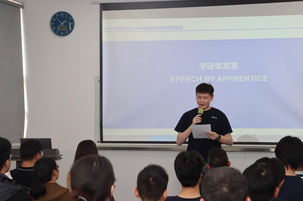 慕贝尔中国区车身事业部运营总监陈汉良,慕贝尔太仓和昆山工厂人力资源经理毛丹,慕贝尔扬州工厂人力资源经理吴向东,江苏联院太仓分院(太仓中专)党委书记丁亮,机械工程系主任侯宏强、副主任徐徐,以及DAWT经理陈彦霖等领导嘉宾齐聚一堂,共同为两位学徒送行。此次前往慕贝尔德国总部进修的学徒张高齐和孙添翼,均是 DAWT 精心培养的优秀代表。在欢送仪式现场,气氛热烈而温馨。