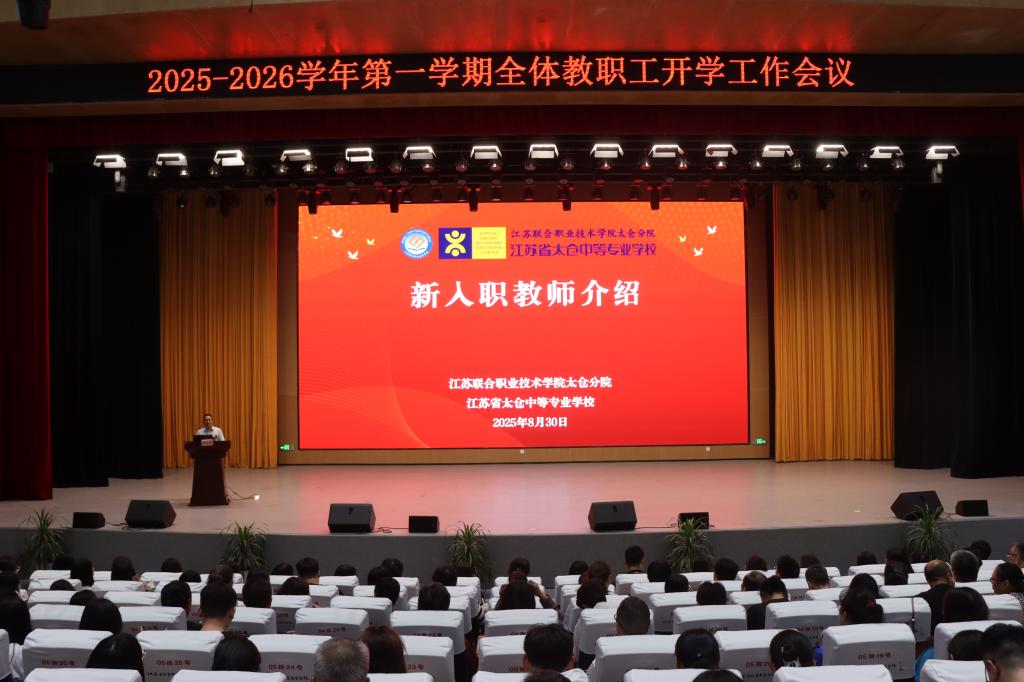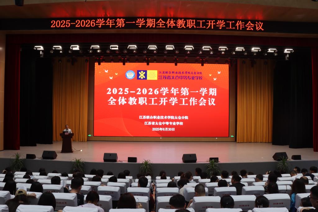 2025年8月30日上午,省太中专(江苏联院太仓分院)2025-2026学年第一学期全体教职工开学工作会议在港城校区报告厅顺利召开,学校校长陆金华等校级领导班子和全体教职工参加了本次会议,会议由校党委书记丁亮主持。