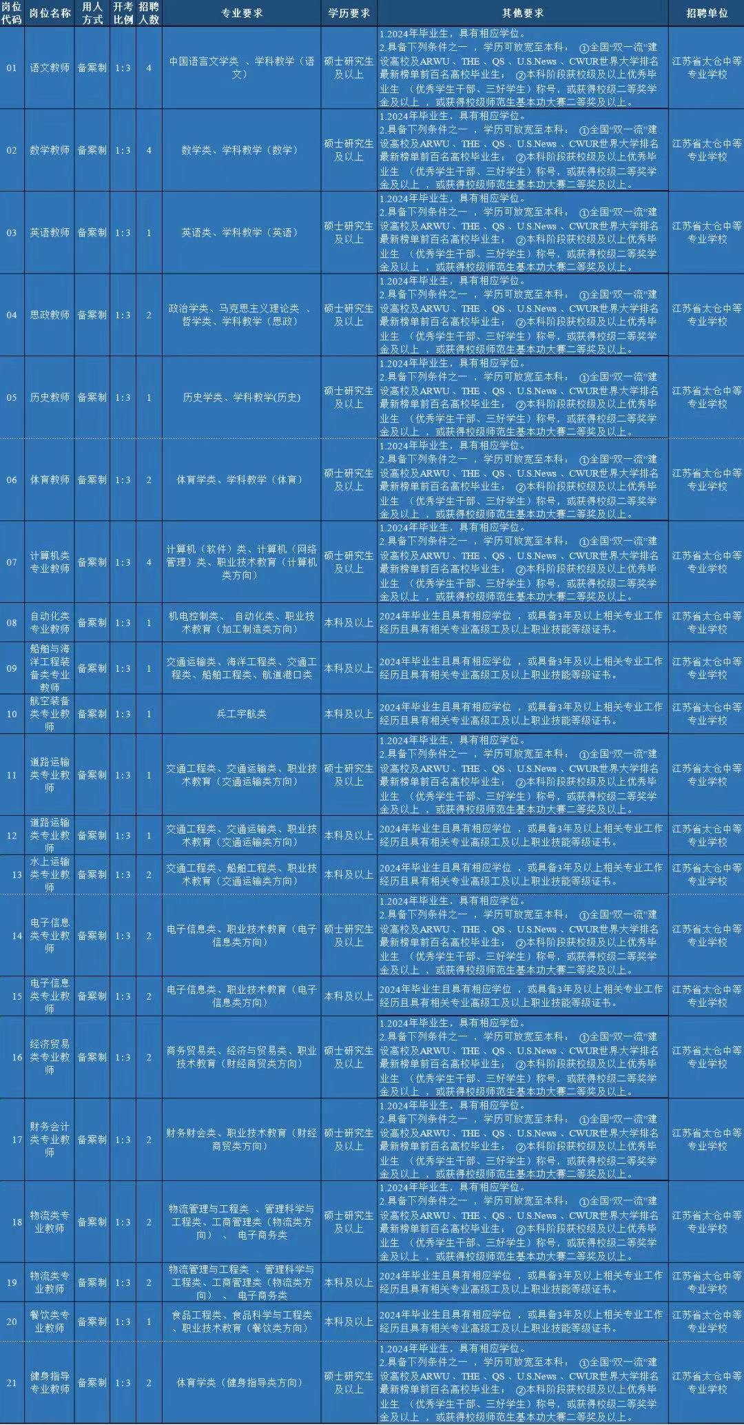 具体招聘岗位、人数及条件详见《2024年苏州太仓市教育局公开招聘备案制教师岗位信息表》(见附件,以下简称《岗位表》)。