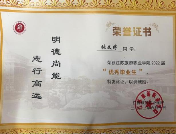 毕业后,张文婷在积累实践经验的同时,继续深造学业,考入江苏旅游职业学院。专科学习期间,她以优异成绩获得“优秀毕业生”称号,并于2022年成功取得专科学历,为职业发展奠定坚实基础。