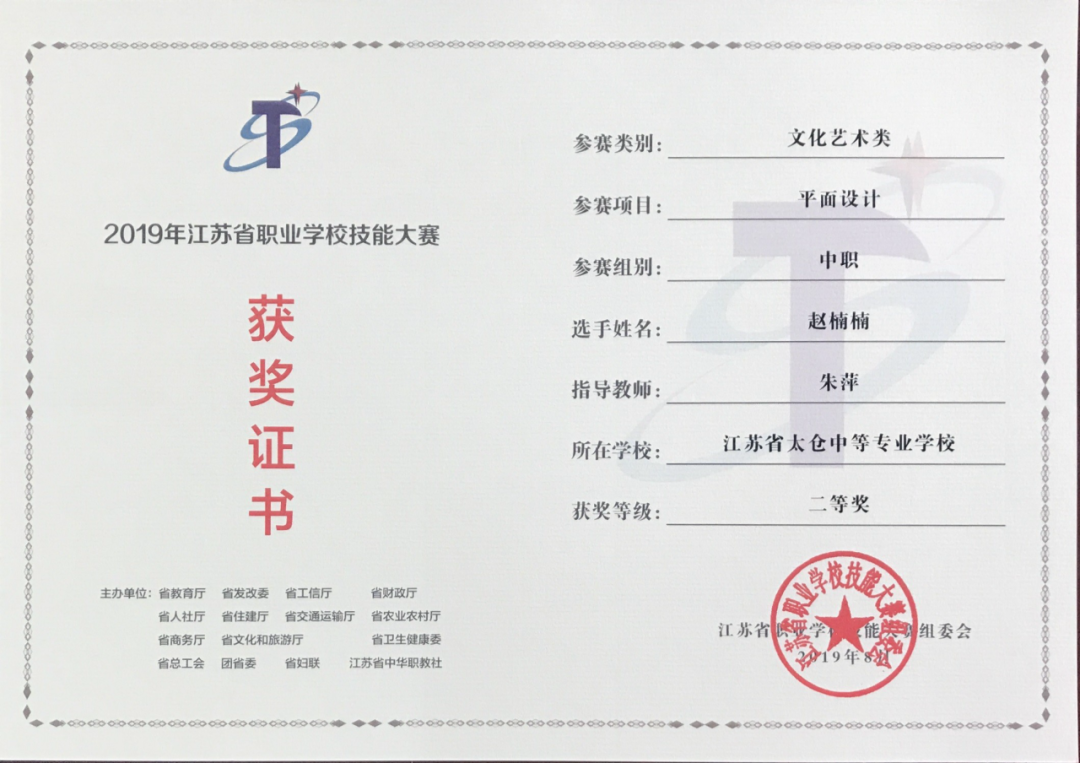 同时,她也在各级各类比赛中不断打磨自己。在老师的悉心指导下,通过自己的不懈努力,取得了江苏省职业学校平面设计组技能大赛二等奖、苏州市职业学校文明风采竞赛一等奖、名城苏州毕业季海报设计大赛一等奖、苏州博物馆画信活动二等奖、太仓市青少年科创赛一等奖、太仓市疫情防控影像作品征集评选三等奖等优异成绩。并被评为江苏省“优秀学生干部”和太仓市“三好学生”。