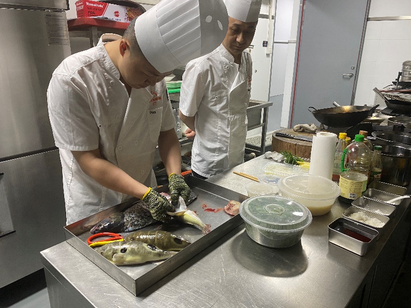 马大师以红烧河豚、糟鱼汤为例给同学们进行了烹饪示范。活动中,马大师细致地展示了两种鱼的加工处理方式以及制作工艺。同学们情绪饱满,认真观看并记录操作要点。活动结束后,同学们纷纷表示参加这样的活动让自己收获颇多,会结合当下餐饮发展最前沿,在以后的学习中有针对性的练习专业技能。