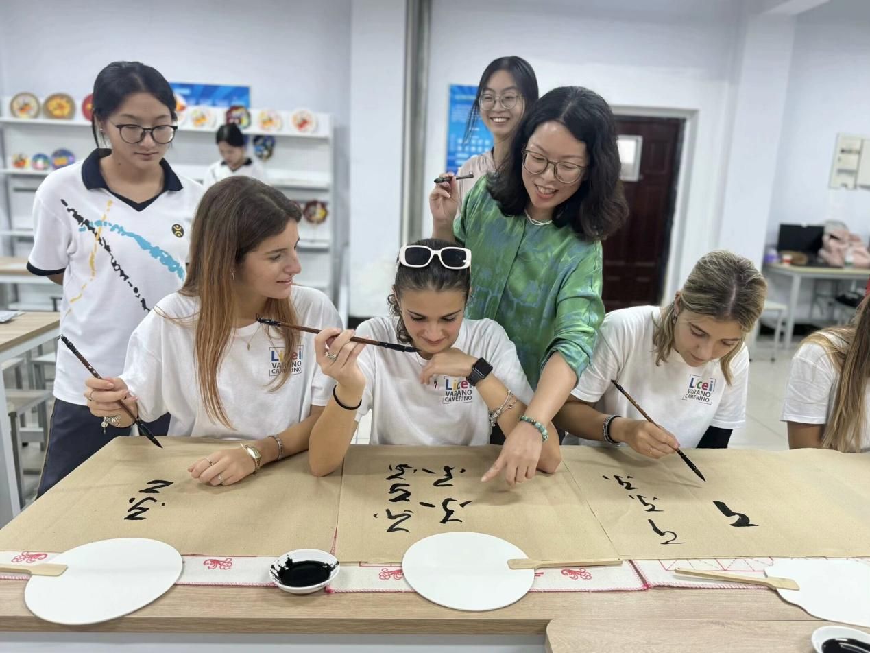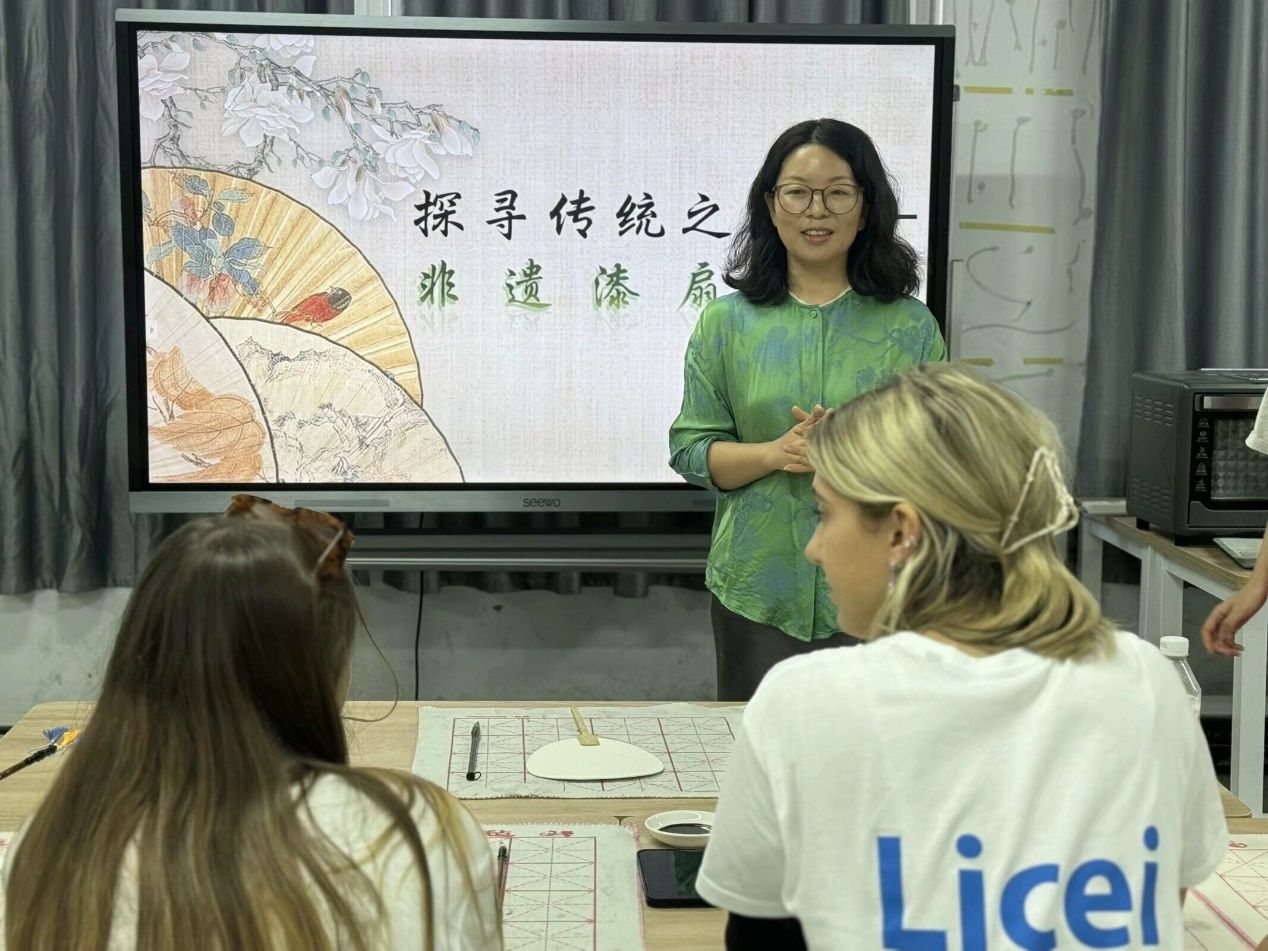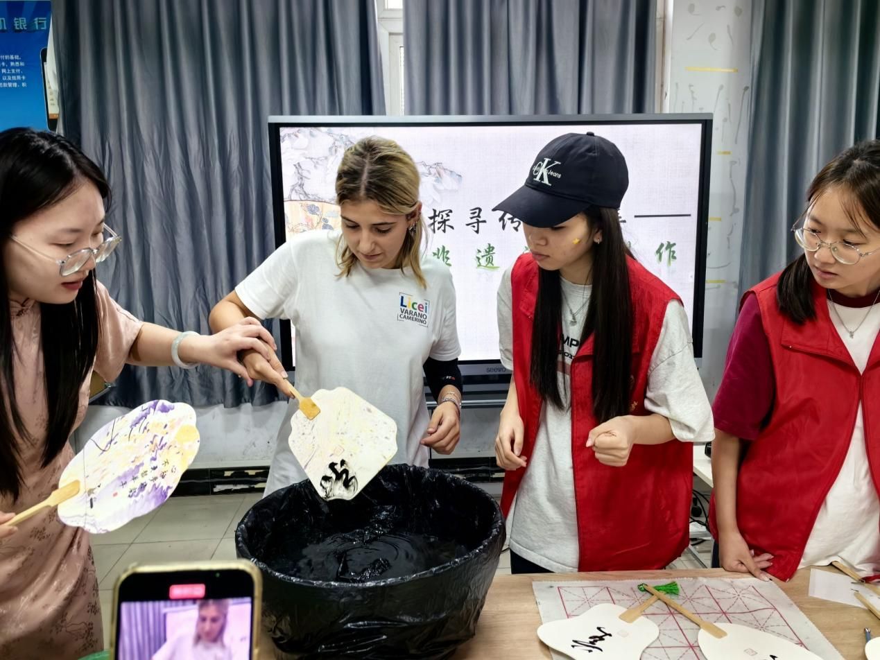 社团活动结束后,艺术设计系的朱萍老师和范姝婧老师带领马切拉塔学生团进一步体验了中国传统书法和漂漆扇制作。在朱萍和范姝婧的悉心传授下,意大利学生们不仅学习体验了中国传统书法,学习书写了“乐”字,还亲手制作了精美的漂漆扇,深刻感受到了中国传统文化的魅力。